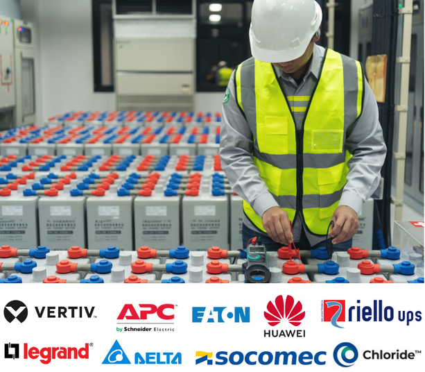 Kami ahli dalam menangani penggantian baterai untuk merek-merek terkemuka, termasuk Baterai UPS Vertiv, Baterai UPS APC, Baterai UPS Eaton, Baterai UPS Emerson, Baterai UPS Schneider Electric, Baterai UPS Socomec, Baterai UPS Delta, Baterai UPS Huawei, AEG, AEC, Riello, Chloride, Test Com, dan berbagai UPS industrial lainnya.